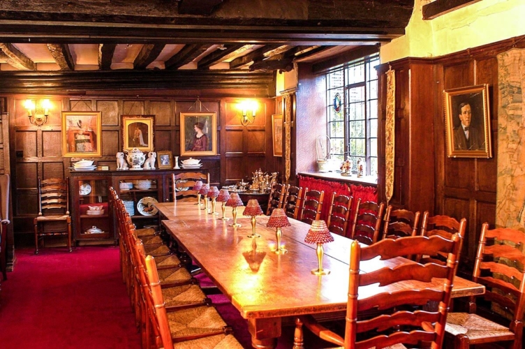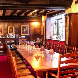 - A wood-panelled dining room with polished wooden flooring and cosy fireplace. This space accommodates 12 guests which can be extended to 26.
