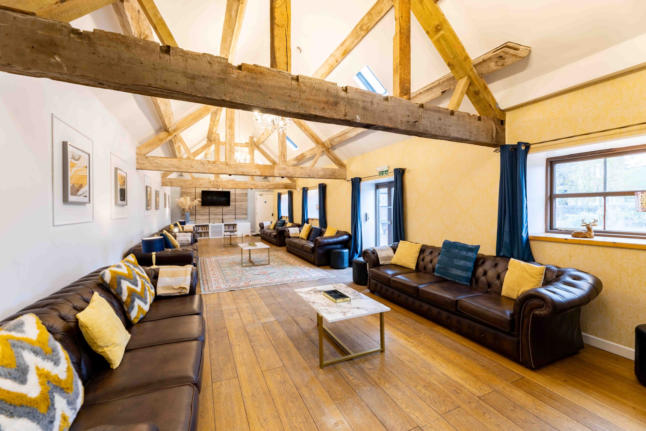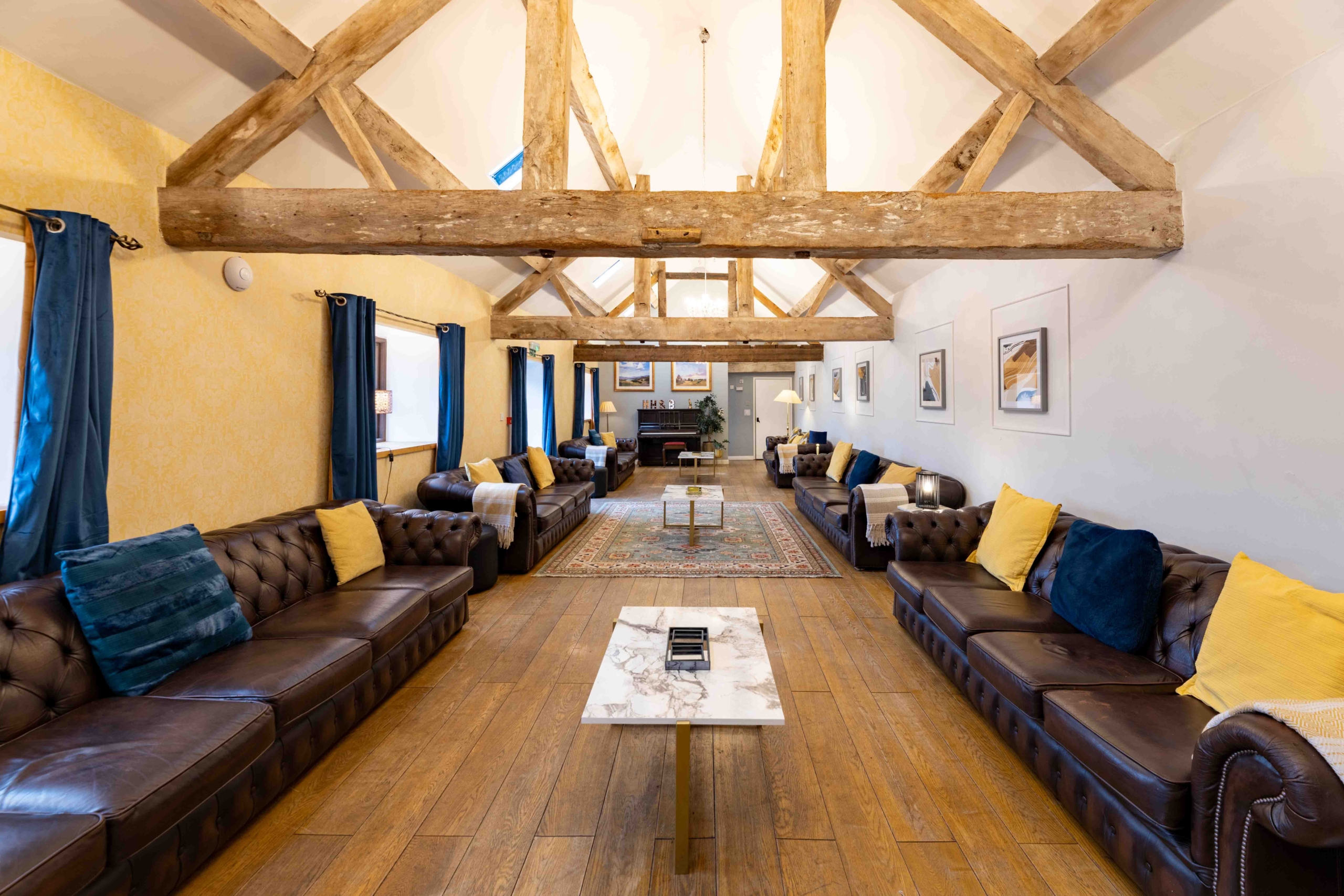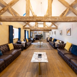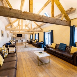 On the barn side you will find two large reception rooms both nearly 50 feet long. One is the dining room which can dine up to 64 guests in one room. Secondly you will find the living room with comfy squishy sofas and a large 60 inch LCD TV. This is perfect for everyone to get-together to relax or even host a party. On the hall side you will find a second living room with a dining room sitting 20. There’s also a mini Xbox snug, a reading room, and a games room with a table football and table tennis. There are also two well equipped kitchens. Whether you want to host yourself or bring in a caterer, there’s lots of space to make that yummy meal.