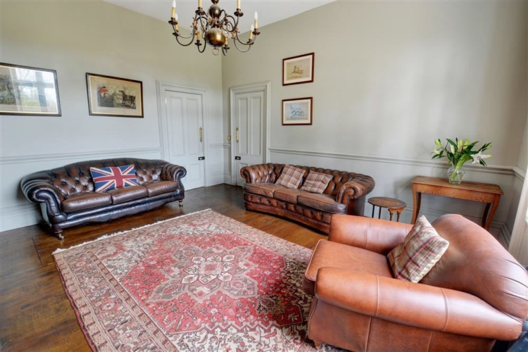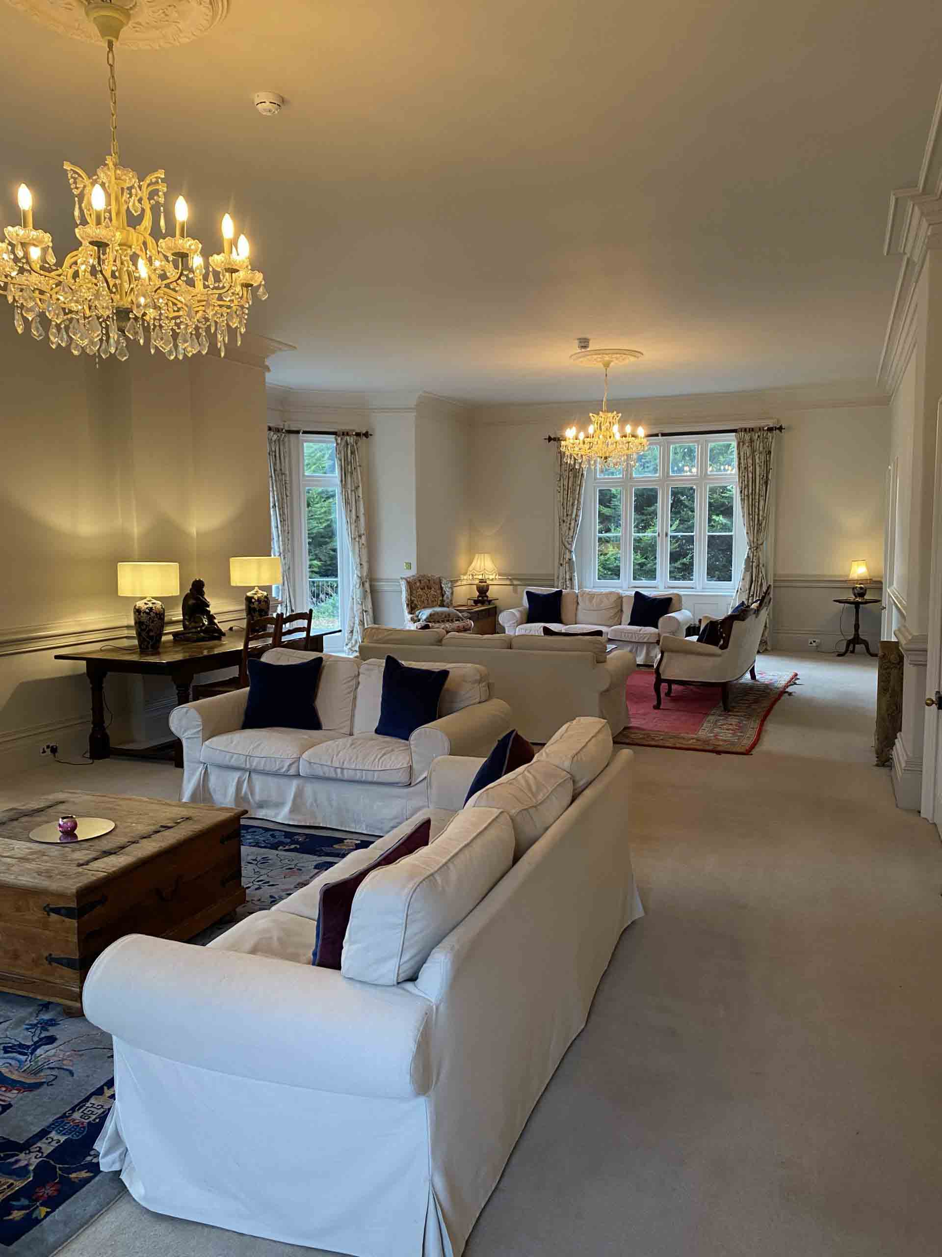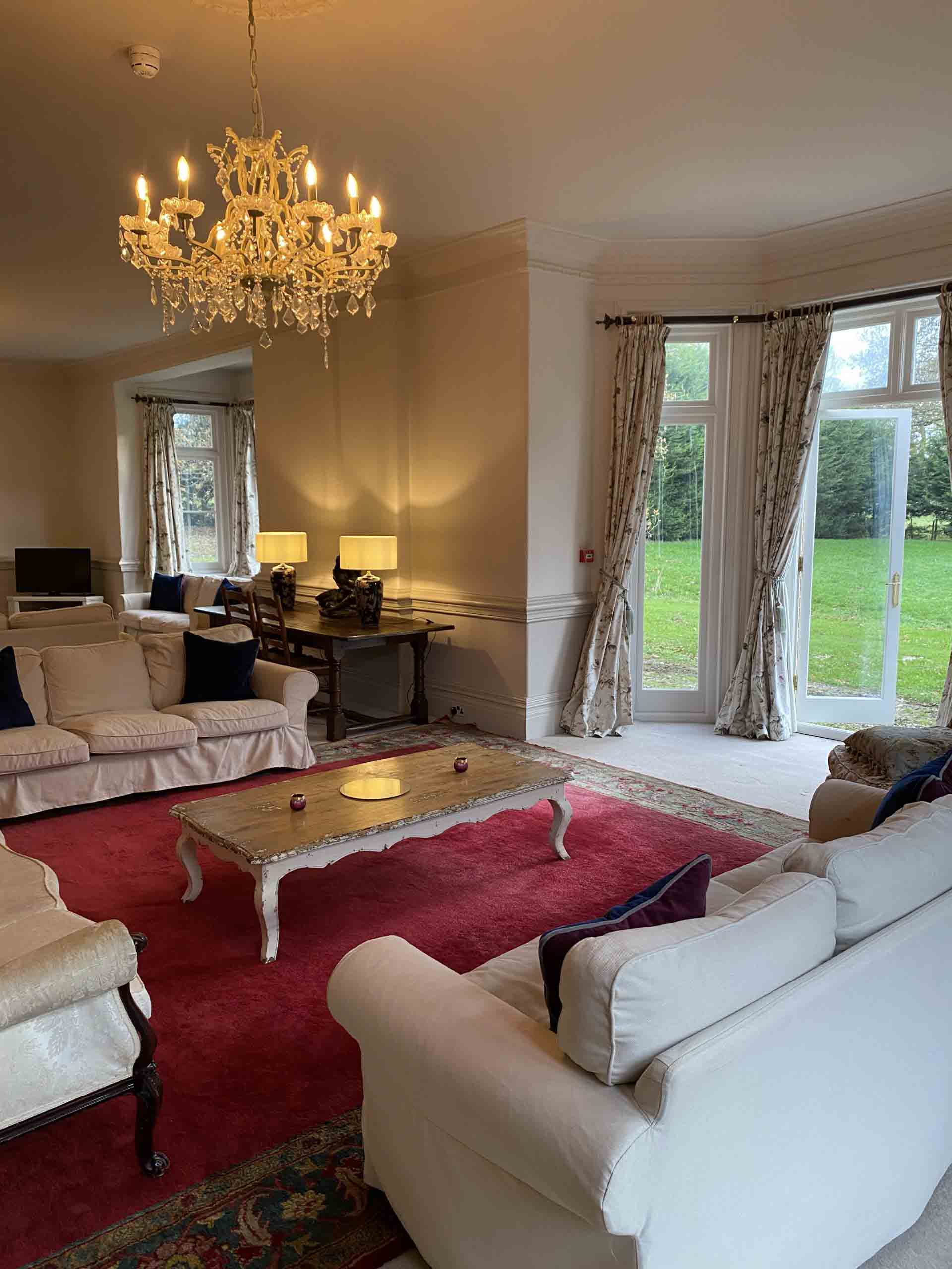 Memory Manor features expansive, light-filled reception spaces including a 14 × 7 m living room with bay windows and French doors opening onto the lawns, marble fireplace, and elegant period detailing. A separate study provides a quieter setting with leather sofas and a wood-burner.