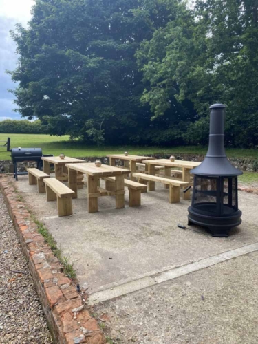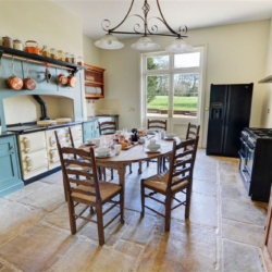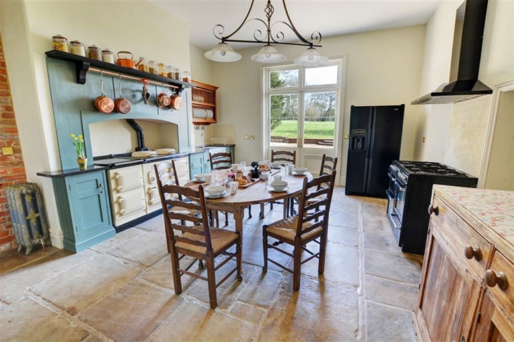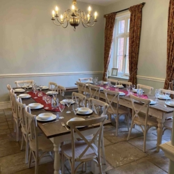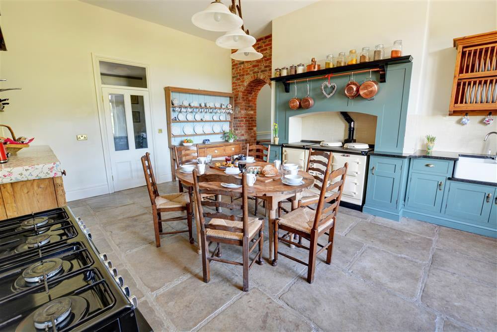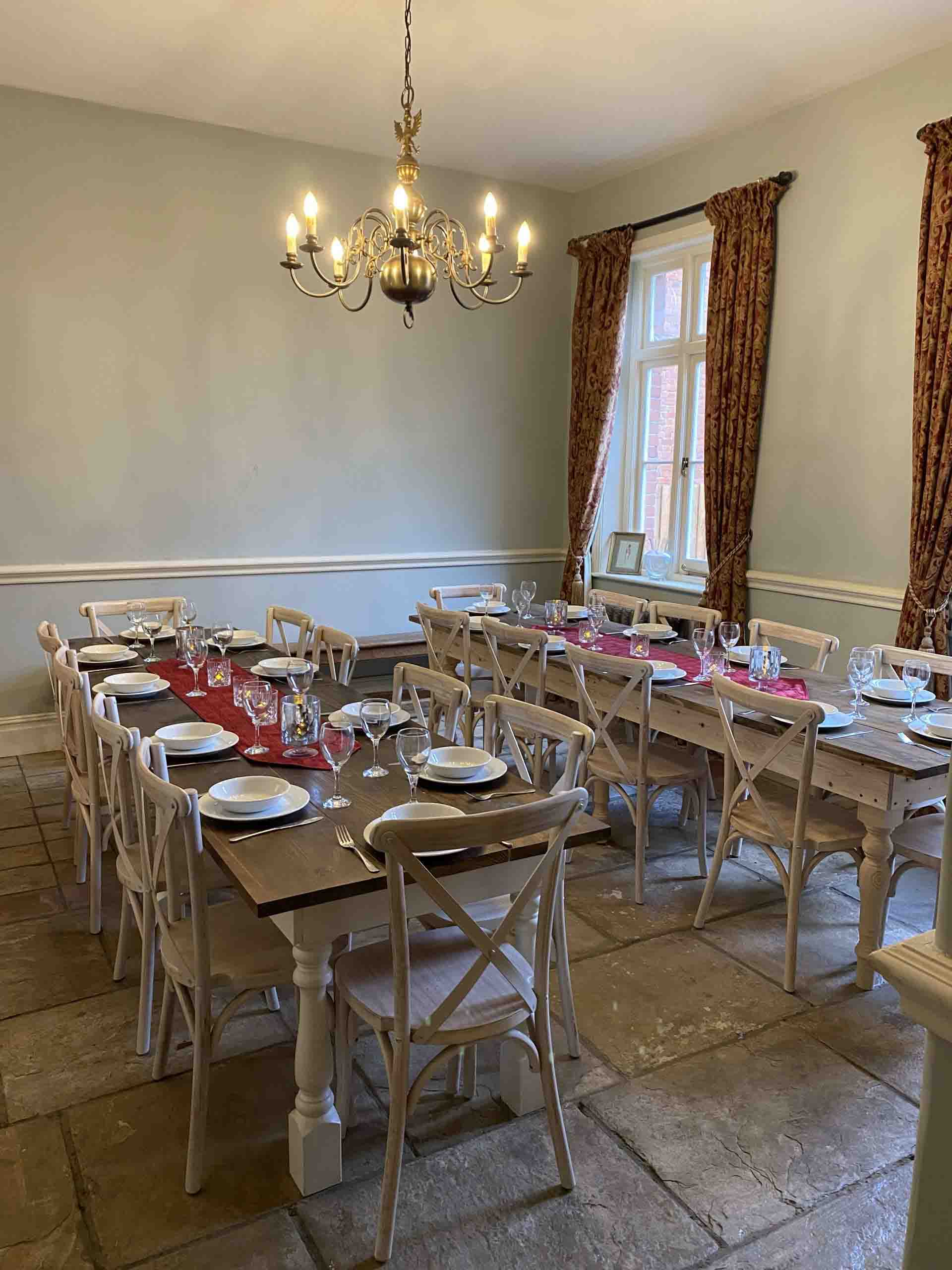 The property offers a large flagstone-floored kitchen with Aga, electric range cooker, custom wood units, and French doors leading to an outdoor patio—ideal for self-catering or catered events. The adjacent dining room, accessed via a brick arch, features a wood-burner and seats up to 36 guests.