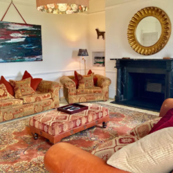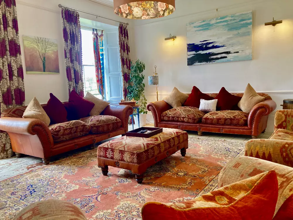 The reception spaces feature a grand living room with cosy sofas around a fireplace and large windows that frame the countryside. The setting offers ample light and an elegant country-house ambience.