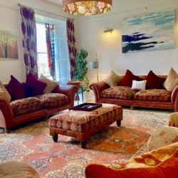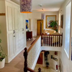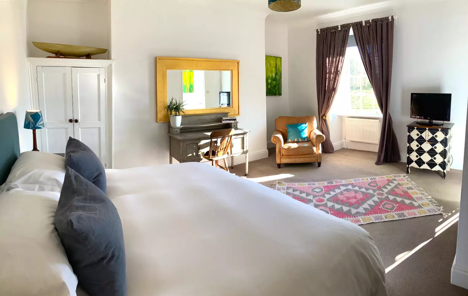 The property comprises nine large en-suite bedrooms across three floors: including a four-poster super-king, super-king/twin configurations, and a family room with two doubles. Beds are king size, each room equipped with flatscreen TV, hairdryer and high-quality white cotton bedding.