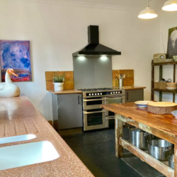 There is a spacious dining room comfortably seating 18–20 guests, paired with a fully-equipped kitchen designed for self-catering and with optional catering services for special events.