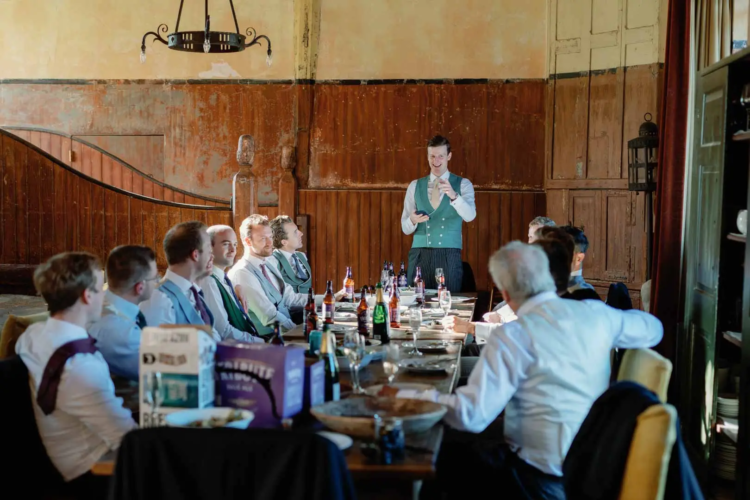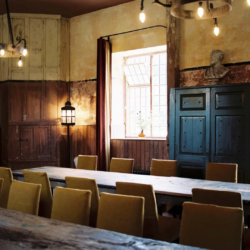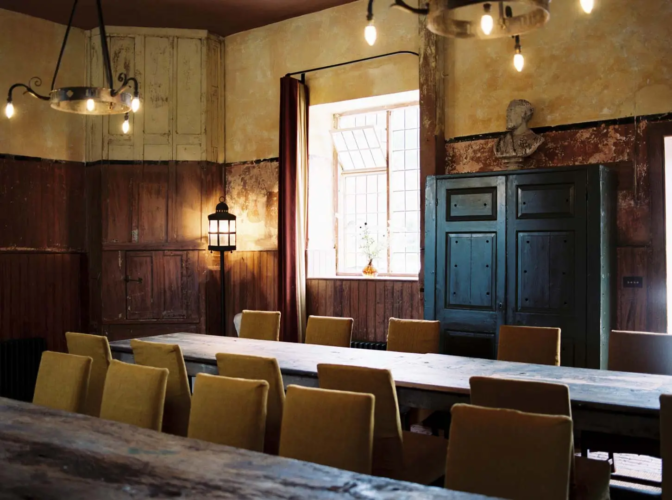 The estate offers a self-catered kitchen fully equipped for large-group cooking, as well as the option of on-site catering via a commercial kitchen. Dining is accommodated in a bespoke set-up with long tables and seating for 30, allowing for formal dinners or group banquets.