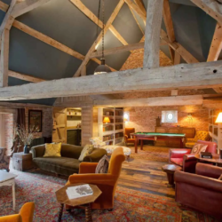 The property features a striking first-floor living area with vaulted ceilings and exposed beams, complete with antique seating, billiards table and bar, a generous space for relaxed socialising or informal gatherings. A ground-floor kitchen and dining area flow into a large formal dining space seating up to 30 guests. Dining & Kitchen