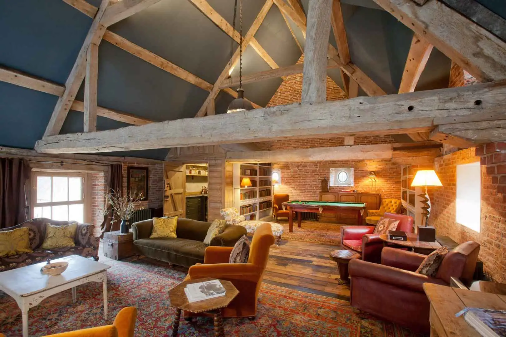 The property features a striking first-floor living area with vaulted ceilings and exposed beams, complete with antique seating, billiards table and bar, a generous space for relaxed socialising or informal gatherings. A ground-floor kitchen and dining area flow into a large formal dining space seating up to 30 guests. Dining & Kitchen
